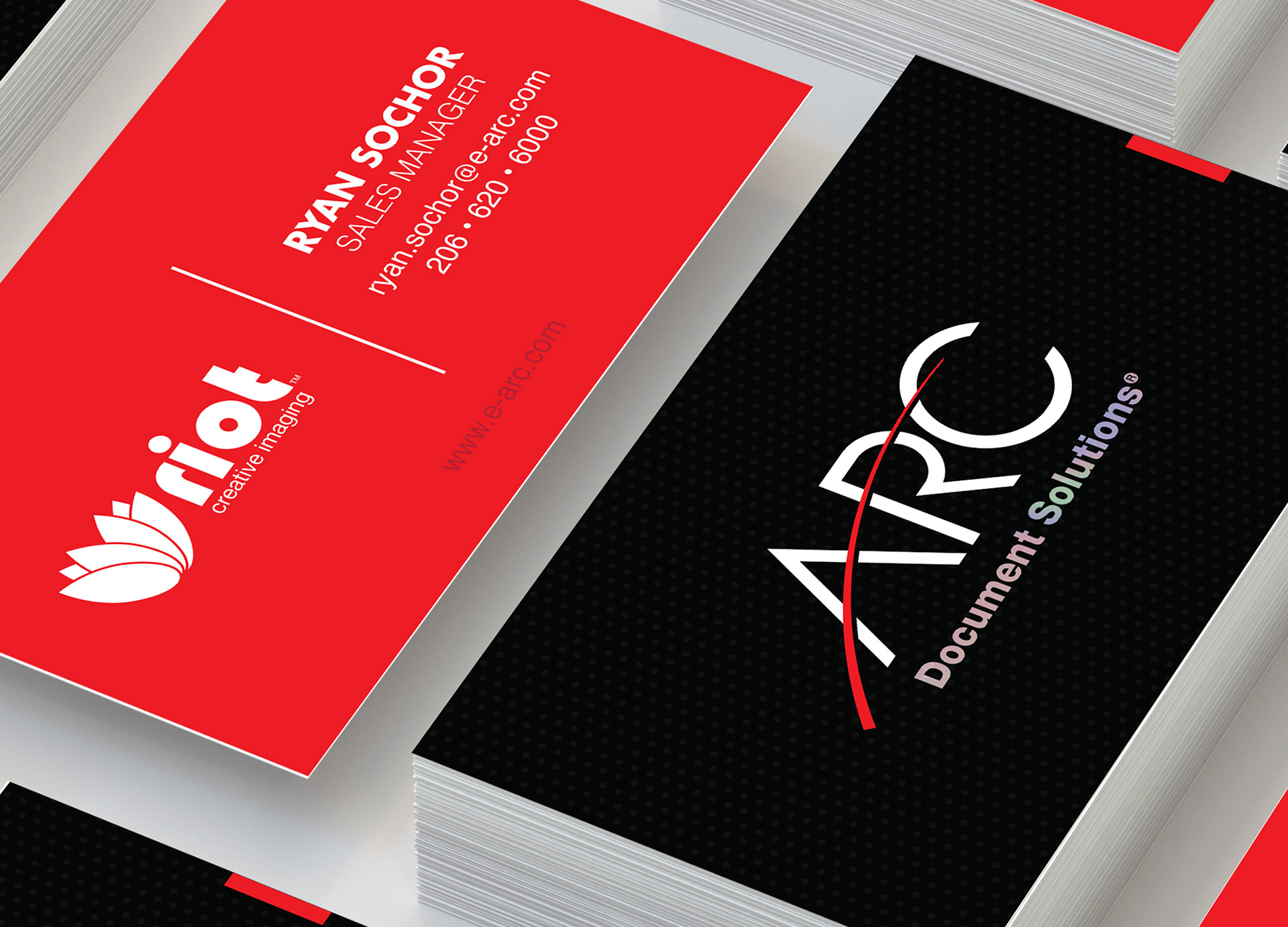 ARC Document Solution's sales manager asked me to design new business cards for their printing facility and creative imaging studio. I scrapped the old layout and designed these eye-catching red and black cards with holographic subheader.