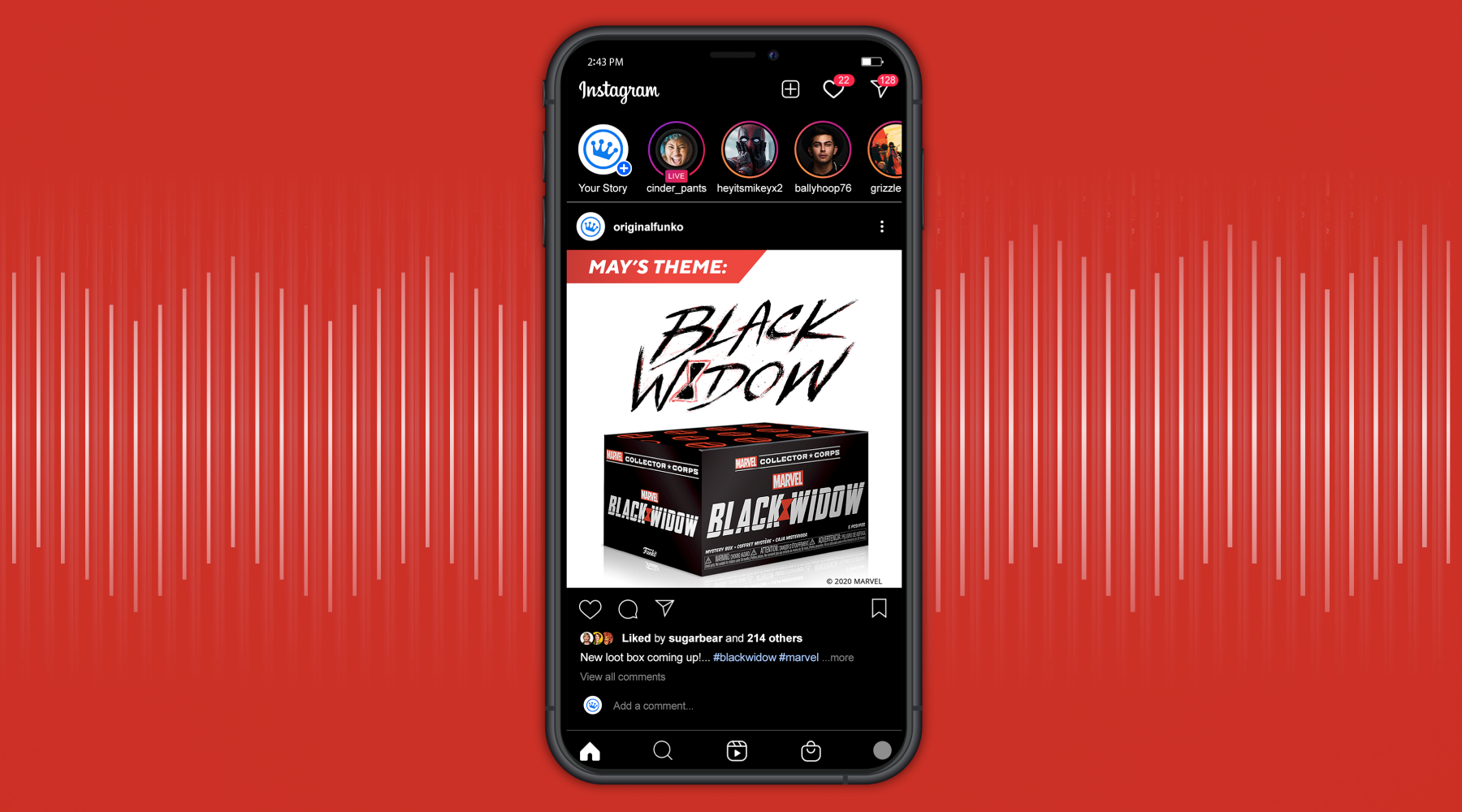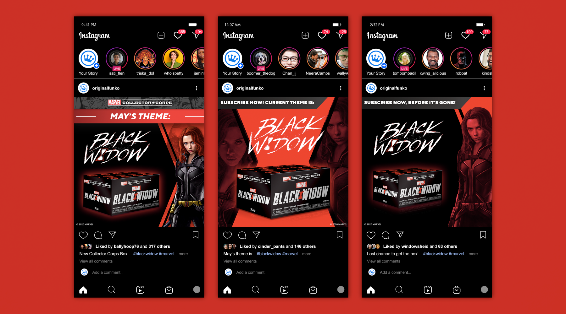 Marvel approached us to help produce assets for their new Black Widow loot boxes. I designed high-contrast layouts to engage our social media channels.