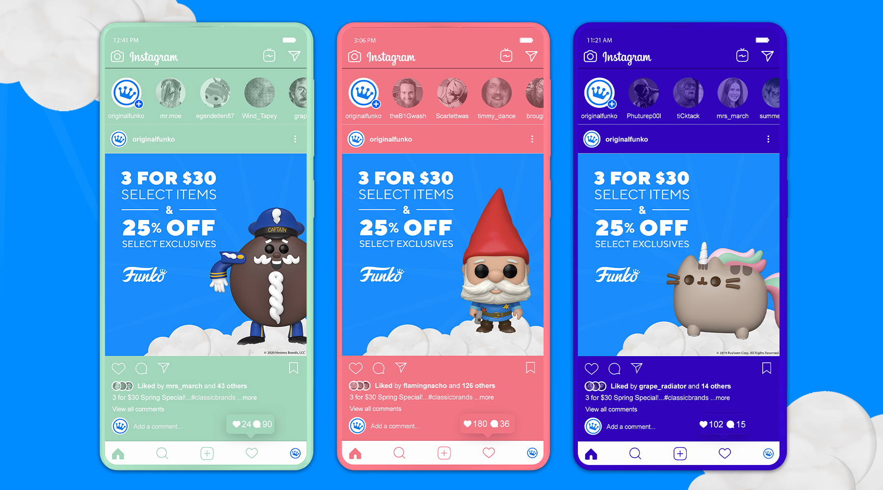 Funko asked me to photograph and create layouts of their new POP! Spring lineup. I designed a themed lockup and integrated it into ads on Snapchat and Instagam.